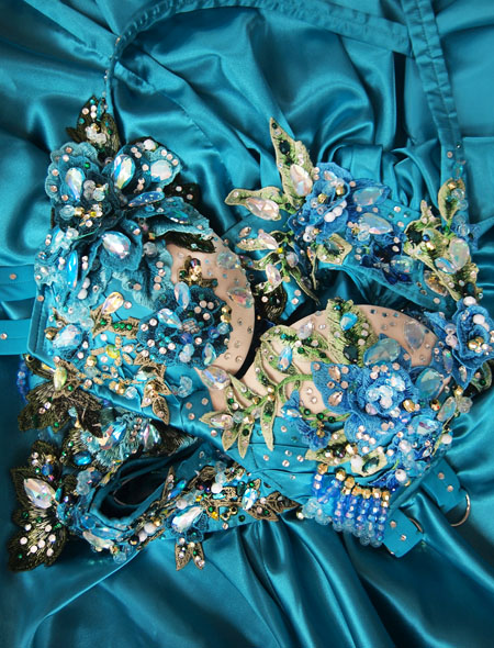 人気の高いターコイズのベリーダンス衣装。大人っぽくも可憐で、とても優雅に見える素敵なベリーダンス衣装です。ブラにもベルトにも装飾がたっぷり施されており、近距離で踊ることの多いレストランショーではもちろん、大きなステージでも映えること間違い無し。360度どこからみても美しく魅せてくれます。ウエスト部分についた大きな花のモチーフレースもアクセントになり、とてもエレガントなオリエンタルコスチュームです。外れにくいブラホックでホールド感も抜群。一着は持っていたいMiLLANA製ベリーダンス衣装です。