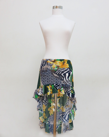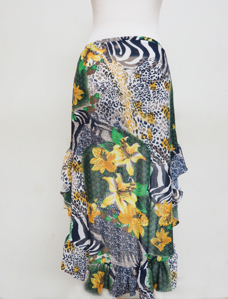 爽やかなグリーンにイエローの大きな花柄。ゼブラ柄、ヒョウ柄も入って目で見て楽しい。いろいろなトップスに合わせても可愛いです。1着持てば着回し力抜群のコインなしヒップスカーフです。