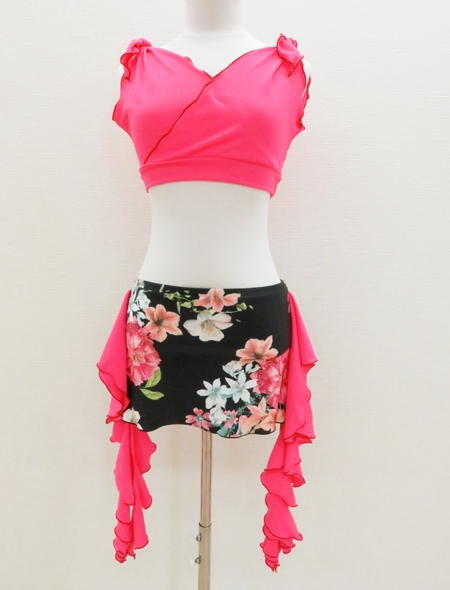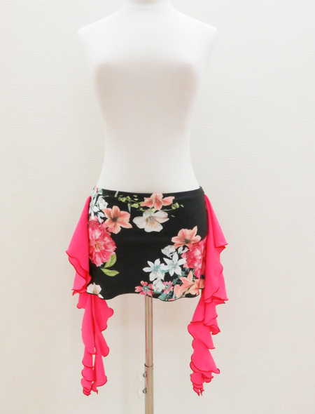 | 製品名: | 黒地に花柄が映える!サイドのピンクのフリルがキュートなコインなしヒップスカーフ【ベリーダンス衣装/レッスン着】 |