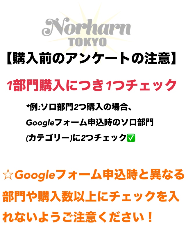 購入数以上にチェックを入れていた場合や、Google申込フォームと異なる部門だった場合Norharn運営事務局より確認を取らせていただく場合がございます。